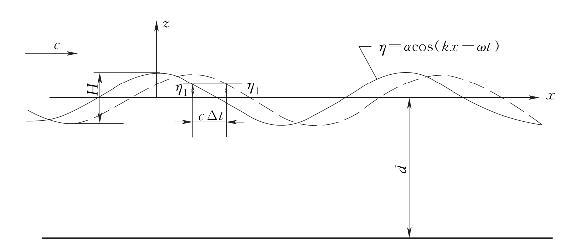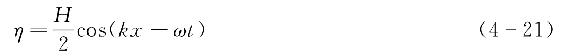 微幅线性波理论是应用势函数来研究波浪运动的一种线性波浪理论。线性波是一种简化了的最简单的波动,其水面呈现简谐形式的起伏,水质点以固定的圆频率ω作简谐振动,如图4-1所示。同时波形以一定的速度c向前运动,波浪中线(平分波高的中线)与静水面重合。线性波理论最初由Airy提出,故又称为艾瑞波(Airy波)。该理论求解中假定波面高度η与波长L之比为一小量,故也称作微幅波。微幅线性波的波剖面与坐标系如图4-1所示。
