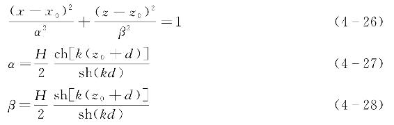 进一步可以发现,式(4-26)~式(4-28)描述的椭圆长半轴α和垂直向短半轴β决定于波浪质点静止位置的纵坐标z0,而与水平坐标x0无关。