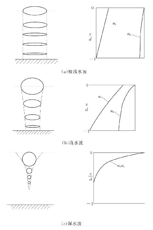 水深对波浪运动起着很大的影响。在深水(d≥0.5L)中的波浪为深水波;在浅水(0.05L≤d<0.5L)中的波浪为浅水波;在极浅水(d<0.05L)中的波浪为极浅水波。这3种波浪其水质点的运动轨迹、水平速度和垂直速度随深度的变化如图4-3所示,图4-3中位于左侧的图形为质点运动轨迹,右侧图形为质点水平速度和垂直速度沿水深变化曲线。