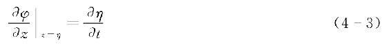 按上述6条假定的最后一条,可以认为波动的自由表面所引起的非线性影响可以忽略,即非线性的自由表面运动边界条件和动力边界条件可以简化为线性的自由表面边界条件。