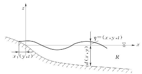 由于式(4-1)边界约束条件中函数xs(y,t)和函数η(x,y,t)均为未知函数,因此拉普拉斯方程的求解域不仅随时间而变,而且本身也是要求解的一部分。对于线性波,为了能唯一确定速度势φ,所需要的边界条件包括海域底部运动边界条件、自由表面运动边界条件和自由表面动力边界条件。