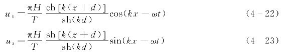 不同相位和深度位置下波浪质点的水平速度ux和垂直速度uz分别如式(4-22)和式(4-23)所示。