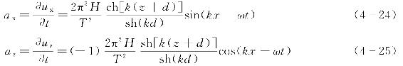 不同相位和深度位置下波浪质点的水平加速度ax和垂直加速度az分别如式(4-24)和式(4-25)所示。