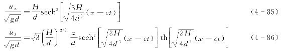 类似的,将模数k=1代入式(4-71)和式(4-72)可得到孤立波的速度分布。近似取一阶而略去高阶项,波浪质点的水平向和竖向速度ux、uz分别为