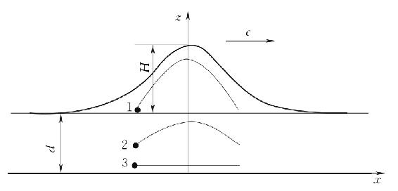 纯粹的孤立波全部波剖面在静水面以上,波长无限,如图4-8所示。设波峰沿正x方向传播,当波峰位于水面质点1的左侧很远距离时,质点1的运动可以忽略。随着波峰的移进,质点1开始向上并向右运动。波峰经过时,质点1上升至最高位置。当波峰移去后,此质点倾斜下降,直至波峰传至相当远为止,质点又恢复几乎无运动的状态。质点1的运动轨迹为一抛物线,由于波峰经过而移动了一段水平距离。质点2的运动轨迹与质点1相似,水平移动距离也大致相同,但其上升的高度比质点1要小。遵循同样的规律,质点3沿底面移动类似的距离。