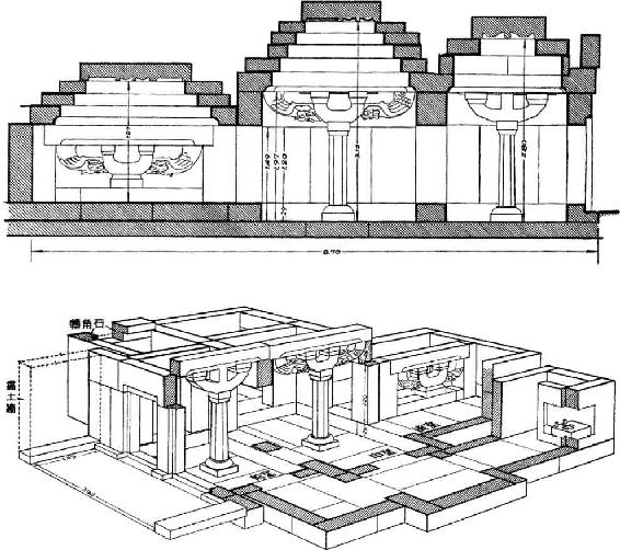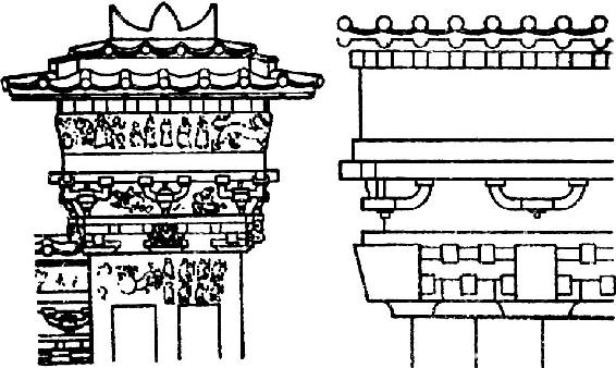 穆勒氏的例子在形似上虽然很占优势,在推理上却未必很能服人。我国建筑为一种土、木合一的建筑,故自始即有很浓厚的木造构物的色彩。木造建筑的形态,在建筑之发轫期,没有可能完全模仿以土、石为主的中亚或西亚建筑。如果有文化移植的情形发生,其能发生影响的部分,多限于性质相同的部分。比如西亚之“台”与中国古代“台”之间的关系,虽然扑朔迷离,却有十分之可能性,所差的只是找出历史的根据(23)。盖两者之间之共通性甚多,相互假借之可能性亦甚多之故。又建筑上的附属装饰,特别是石刻的艺术,或图案的艺术,都是容易感受影响的。我国六朝以后的石刻,深受中亚、西亚、印度之影响,可以作为说明,因其用材相同,使用之部位相同,有充分移植之条件。但是两类完全不同的材料所产生的构造物,在结构与构造部材上着意模仿,是不十分可能的。