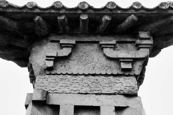 可是在同一墓中那些宝贵的石刻里,有几幅非常动人的建筑的图画,可以告诉我们这件故事的部分真相。沂南汉墓的石刻相当确实地描写了汉代沿海地区的木结构与空间形式及其装饰纹样,在建筑史上的贡献是不可言喻的。在这些石刻纹样中,一般的建筑上是没有斗栱的形象的,只有在地位显要的建筑上才有。其中最动人的一幅是描画了一座两进的四合院,在中轴线上,大门、二门均有熟悉的兽环,在位置最尊的第三进的正面,赫然有一个一斗二升的形象立于正面。如同哥特教堂大门之中柱一样居于二柱之间。这个形象与该墓本身的斗栱一样,无论在尺寸上与建筑物之比例,或就其位置、形状看,都不能说与结构或构造有任何之牵连。若仔细注意院内之陈设,乃发现一斗二升之前有一铺砌之平台,台前有一几,几之两旁有鼎、钟等祭典用具,使人觉得若不是斗栱本身就是神明,至少它是室内神明的护神。如这样想,则西亚建筑装饰中的有翼狮身,与这一斗二升就具有同样的功能了。
