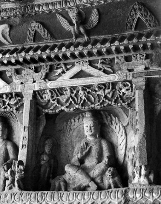 第二类是我们所不希望看到,而竟公然出现,因此扰乱了斗栱发展的逻辑的。在天龙山第一窟与南响堂山第五窟均有庞大的斗栱形象的门楣。其最重要的特色是它们的一斗三升系统不在柱头上,而是在柱间,人字原来是补间的,却落在柱头上(天龙山)。这是非常难于解释的现象,特别是出现在有建筑尺度的雕刻上,很难否定它的存在。