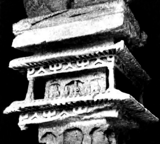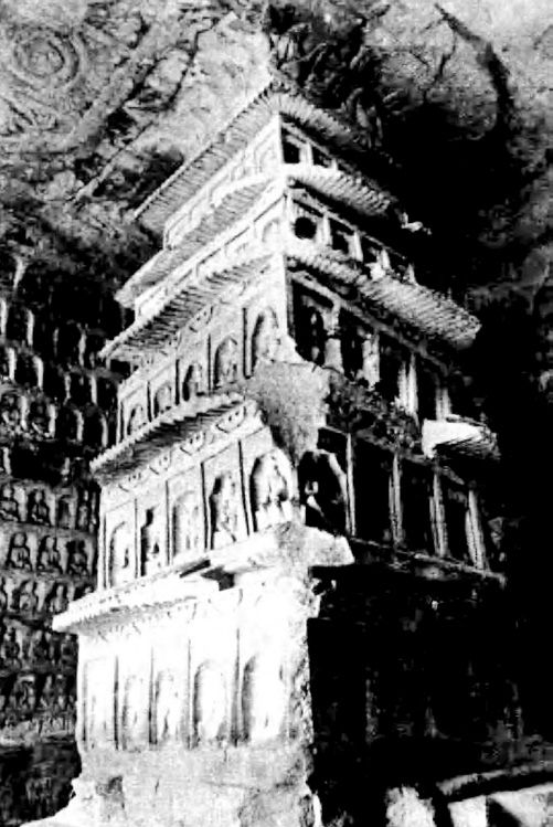 第三类则是饰带式的形象。此种形象在云冈石窟中处处可见,显然不能表示任何结构的意义。这些饰带有时与宗教性装饰的纹样纠结在一起。这种形式除了暗示我们一斗三升与人字补间是当时已固定化了的意象以外,可说没有多少价值。其中比较启人疑窦的是在云冈第二窟北魏塔柱上,以立体的雕刻表示出了一斗三升与人字铺作的系统,但却只在四角上有柱子。由于塔柱的本身是十分逼真的建筑,令人怀疑在当时饰带式的形象是否发生在真实的建筑上。