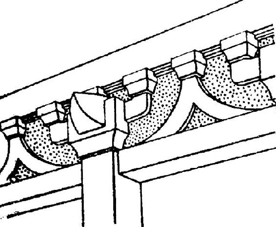 由于西式柱范的采用,正面的额枋就被提到柱头以上,成为过梁,一斗三升与人字补间的连续就顺理成章地取代了西式庙宇上的饰带,这是我国建筑史上在明清以前的首次斗栱饰带化时期。因此,独立柱身与梁枋在柱头以下连结,而把斗栱当作装饰来处理,是很说得过去的。