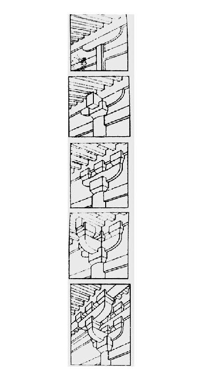虽然苏波氏没有说明这种发展产生的原因,但大体上在常识上是说得过去的。我个人不十分赞同他的第四图解,因为自结构机能主义的角度去看演变,则华栱之出跳必有其目的,只为了托住突出之梁头是说不过去的,我认为这一步可以与江南民间之建筑一样,托住一根檐檩。进一步接上第五阶段的令栱的出现,则觉十分顺理成章。但是整个说来,程序是很自然而顺适的。至于要深究此一发展的理由,由简而繁、装饰性增加的要求,可以解释一部分;出檐渐求深远,可以解释另一部分的原因。只是在历史的发展上,很难用这种单纯的理由来说明汉代望楼上的复杂的斗栱系统反而演变为简单的一斗三升。