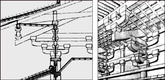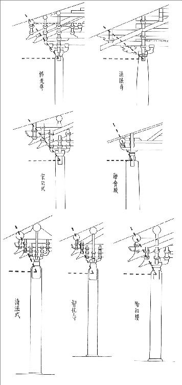自日本的遗物看,这些图解不必一定说明时代的顺序,也可以看作装饰等级不同的表现,可以应用在同一个时代里。在约建于公元733年的日本奈良东大寺法华堂上即出现了等级不同的几种斗栱,虽然为一今日不易理解的现象,却可证明这一点。当然型制较繁的斗栱必然在型制简单的斗栱之后,社会制度等级细分的要求可能促成各种简繁型制的并存,甚至其发展(4),未必一定要归之于结构演变的需要。