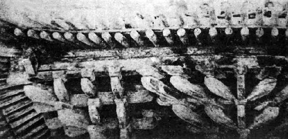 其中最显著的一项成就当然是斜栱。在构造上说,斜栱是呈45度或60度互相交叉的斗栱组,出跳支撑挑檐檩,而且后尾亦压在内部结构的梁下。它的好处有两点,第一是比较稳定,因为它是有四个支点的斗栱组,以阑额上的坐斗为杆的中心;第二,在柱间较阔的情形下,它是由一个斗栱组提供两个支承的经济的方式,可以缩短挑檐的跨距。第二点很容易明白,如果不这样做,恐需要两朵斗栱才够。至于在构造上的优点则可以比较传统之斗栱与斜栱之不同。传统之斗栱通常需要很复杂的横栱来扶持,以保证其稳定,但斜栱使用交叉互相扶持的道理,则简单又合理。当然斜栱亦可有复杂的横栱装饰的。(22)