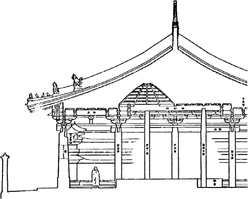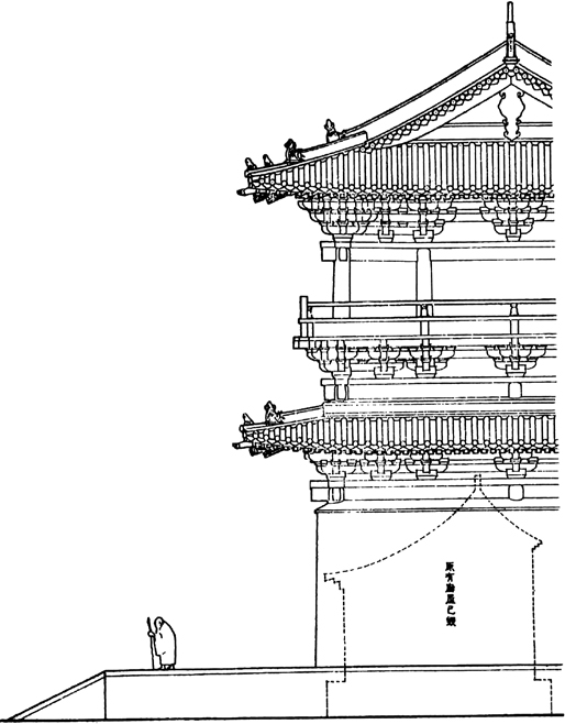 实际说来,生起、侧脚是一些细节,其目的是造成正面檐线下垂的视觉效果,与正脊的下垂曲线原是形式上同类的东西。这种正向屋面的弯曲形状,其形成的时代与理由均曾于上文中讨论过,但是自六朝以来到佛光寺大殿之间的三四百年间,我们竟没有任何证据,说明正脊与檐线下垂是六朝以来一贯的传统。在前面所一再提到的大雁塔门楣石刻与日本唐招提寺金堂均有十分平直的正脊与前檐,只有翼角之起翘。大雁塔石刻上之翼角起翘似乎与斗栱系统也没有明显的关系。