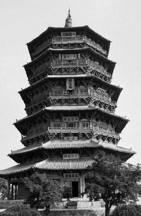 以独乐寺观音阁为例,在外表看去似乎很符合唐代系统,但是经过苏波氏之调查,该阁竟有二十四种不同的斗栱组(18),实在是令人惊讶的。建于1056年的佛宫寺释迦塔(应县木塔),在其下部的两层的正面,即可指出七种显然不同的斗栱组形态,包括出跳数的不同,昂、抄数目分配之不同,慢栱之数目的不同,出跳角度的不同。即使以各层分别看,除平坐以外均无明显的韵律。其第一层中央为45度之斜栱,有较大之面阔为五铺作。柱头为标准之五铺作斗栱。(19)补间为二跳,然无令栱与慢栱,故形式很小,转角为45度栱与横栱之结合。上檐头为标准的重下昂出双抄七铺作斗栱,而中央补间虽亦为重下昂出双抄,但无慢栱与令栱,于令栱处以替木代之。其转角铺作则为45度栱与双抄无令栱之结合。平坐斗栱亦不标准,为一标准五铺作斗栱于令栱处多华栱一跳,以散斗上承平坐外缘的枋子。第二层檐下斗栱之柱头铺作亦为标准之重下昂出双抄斗栱。其中央补间铺作则为60度华栱二跳上承慢栱的很特殊的组合。而转角铺作虽仍为三下昂出双抄,但正面之45度斜栱只出二跳,另二跳则由华栱负担。笔者不厌其烦地指出各斗栱之不同,在具体说明其工匠之自由所到达之程度。
