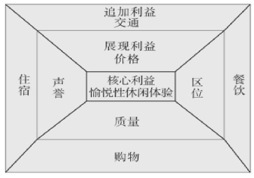 其中,核心旅游产品带来了旅游者愉悦性休闲体验的核心利益,组合产品带来了旅游者餐饮、购物、住宿等方面的利益(图2-1:旅游产品的利益构成)。核心旅游产品的类型并不一致,可能是主题游乐设施、温泉洗浴、水公园等产品项目;组合产品则主要包括承载吃、住、行、购等方面功能的产品,诸如住宿设施、购物街区及商店、旅游纪念品等都是组合产品的组成部分;外围旅游产品的主要功能是增强旅游者体验的满意度与舒适度,如景观环境、景区小火车、休闲座椅等基础设施与环境等(图2-2:旅游产品的构成)。
