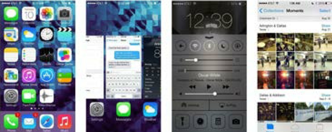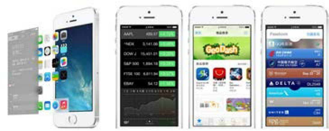 相较于历次iOS的改动来说,iOS 7最大、最直观的改变当属界面图标的全新设计。原有图标常用到的玻璃和渐变效果被抛弃,取而代之的是色彩对比鲜明、更加扁平化的图标,这也与目前设计领域的整体趋势相一致。新图标不再沿用以往的“拟物化”风格,而是采用了更加简洁的符号,使图标看起来更加清晰明了。iOS 7 更加重视感应智能改变桌面效果。iOS 7 增加了多任务视图,如同Windows 7系统中的任务管理器一般方便且实用。控制面板打开更加方便,用户在任意界面向上扫屏幕都可以进入控制面板。在控制面板中,用户可以打开或关闭无线局域网、蓝牙、勿扰模式、是否锁定屏幕旋转、调整屏幕亮度和音量等;同时,用户也可以在此对iPod 音乐播放器等进行控制;此外,还能快速打开手电筒、计算器和相机等应用。iOS 7的相机功能也得到了增强,新增加了滤镜功能,给用户拍照带来更多趣味体验。