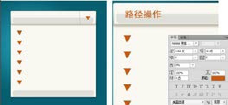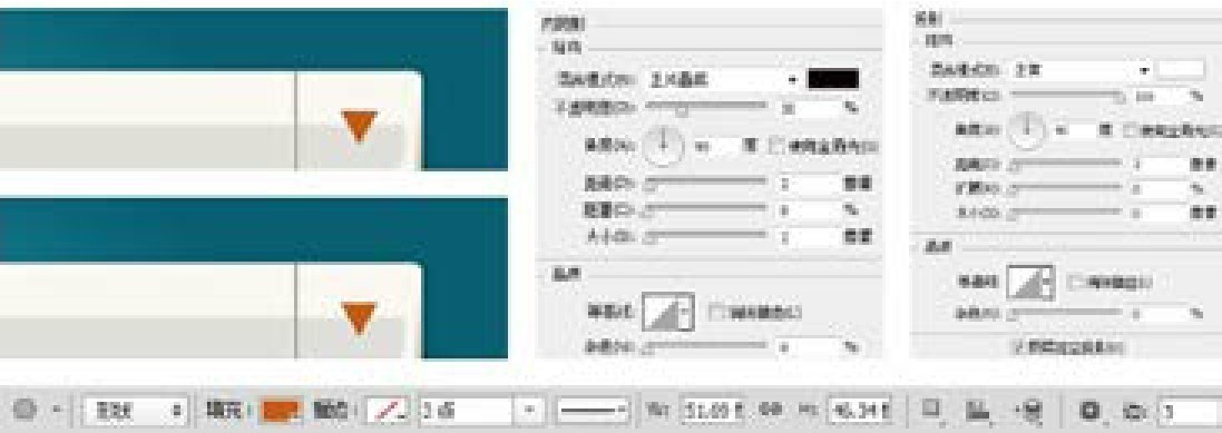 下拉选框由圆角矩形按钮、分隔线、下拉三角和选项文字组成。下拉选框的长度比一般按钮要长,在绘制圆角矩形按钮时注意拉长按钮,留出摆放选项文字的空间。