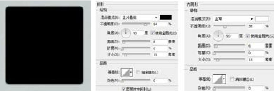 ③单击圆角矩形工具,在其属性栏上选择“形状”选项,在属性栏上设置“填充”为黑色,按住Shift键在画面上绘制圆角矩形形状。双击“圆角矩形1”,分别勾选“投影”“内阴影”选项并设置各项参数,完成后单击“确定”按钮(图3.86)。