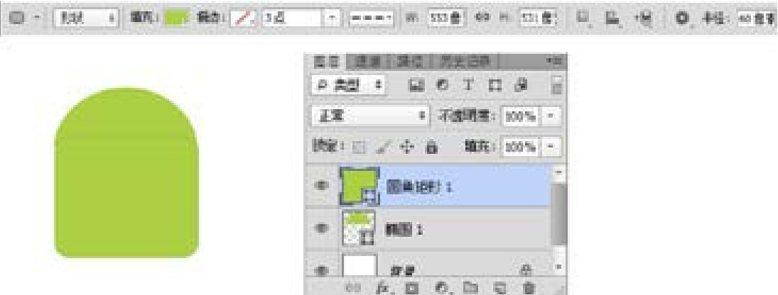 ④单击圆角矩形工具,在其属性栏上选择“形状”选项,在属性栏上设置“填色”为绿色,“半径”为60 px,在画面上绘制圆角矩形形状(图3.144)。