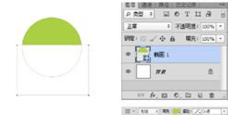 ⑥单击直线工具,在其属性栏中设置其属性为“形状”,“填色”为绿色,然后在半圆上方绘制直线。复制“形状1”,生成“形状1副本”,对复制图像进行水平翻转并适当调整位置(图3.146)。