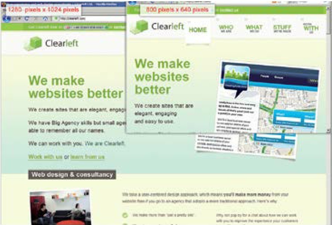 Clearleft 网站就是使用了自适应宽度布局的例子。图4.5展示了网站在1 280 px和800 px情况下的表现。注意看内容区域是如何自动调整“We make websites better”这句话的,在1 280 px时的两行变成了800 px时的3行。