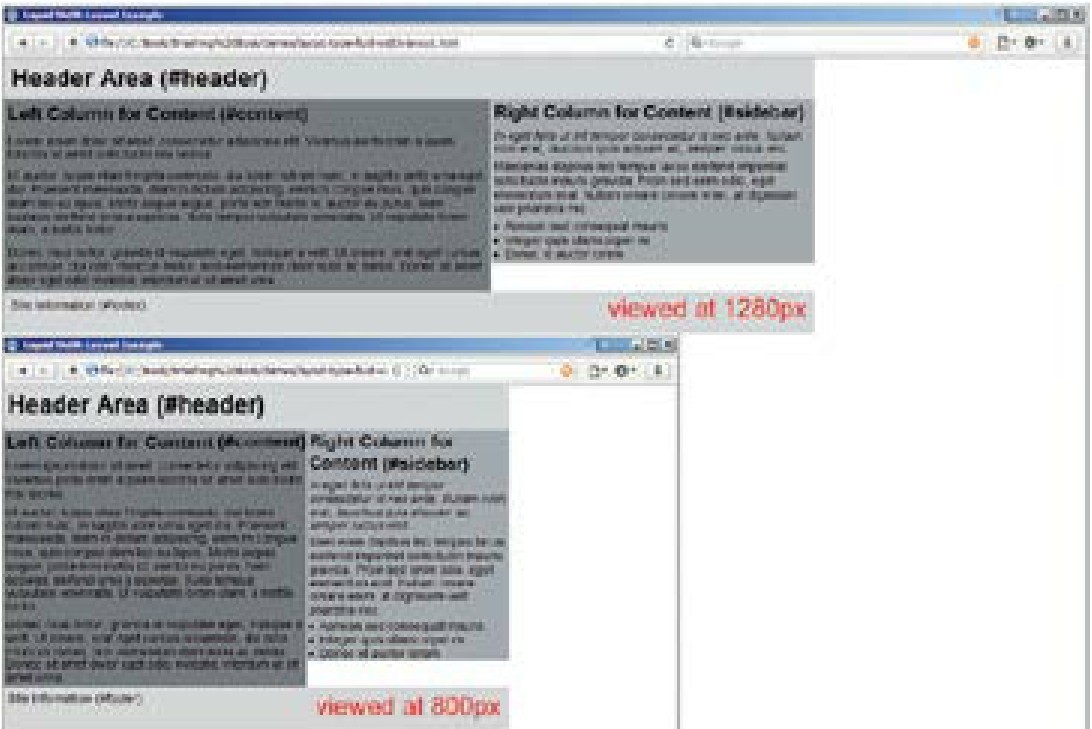 图4.6为一个自适应布局的示例,容器的宽度设置为窗口的75%,并且分别在1 280 px和800 px的环境下进行了测试。