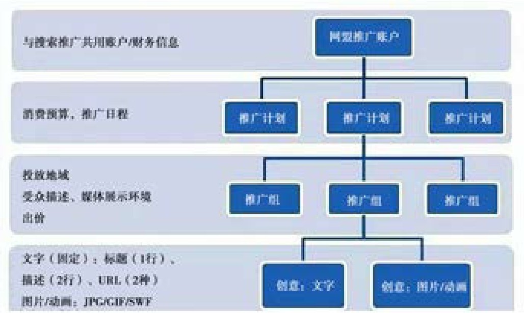 与搜索推广类似,网盟也有一个账户结构,网盟推广的账户是由账户、推广计划、推广组、创意4个层级组成。账户前面已经说过了,这里重点说其他3个层级: