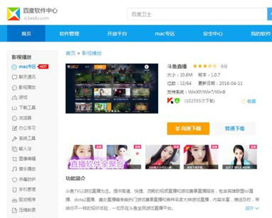 这里介绍一种做外链的方法——通过上传小软件做外链。用百度搜索一下,可以找到很多软件下载网站,如“ZOL下载”“百度软件中心”“太平洋下载”等。打开“百度软件中心”里的“斗鱼直播”,如图3.51所示。鼠标放在官网名称“斗鱼”两个字上,最下面会出现“斗鱼”的某个网页的网址(www.douyu.com),单击“斗鱼”这个锚文本,跳转到该链接指向的网页,如图3.52所示。