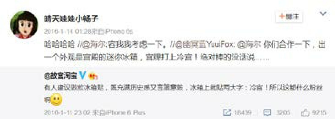 原来,2016年年初,故宫淘宝发布一条调侃微博,声称有网友建议其做一个名为“冷宫”的冰箱贴,既充满了历史感又言简意赅。随后,有网友建议联合海尔,并建议两人合作。对此,海尔表示“容我考虑一下”,故宫淘宝又回应:“给一个窜天猴,要不?”如图4.39所示。