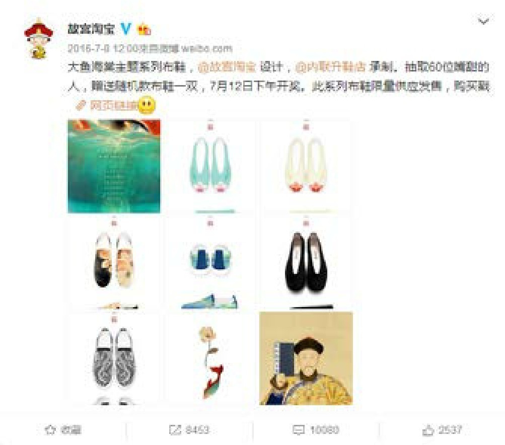 除了向名人明星借势之外,主动向热门IP借势,以此提升品牌知名度和美誉度,也是故宫淘宝常见的事件营销方法之一。比如,此前在电影《大鱼海棠》热映之际,故宫淘宝也趁机联合淘宝某鞋店,不仅推出了大鱼海棠主题系列布鞋,更声称“这属于限量供应发售的布鞋,而且在微博上将抽取60人赠送布鞋一双”,短短几小时转发评论就超过10 000条,如图4.40所示。