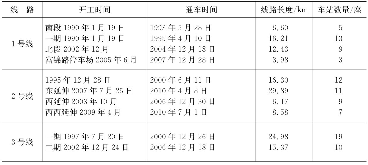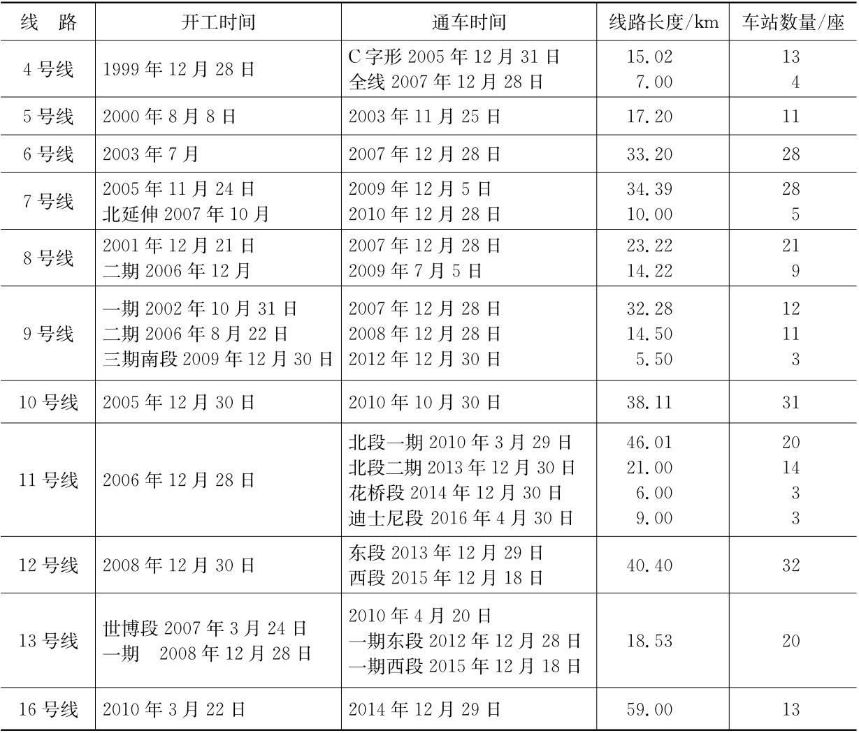 上海轨道交通投资建设管理按照时间顺序可大致可分为四个阶段、三种模式。完成了588km(未含磁浮线)的轨道交通网络建设,具体线路与基本情况如表1-1所示。