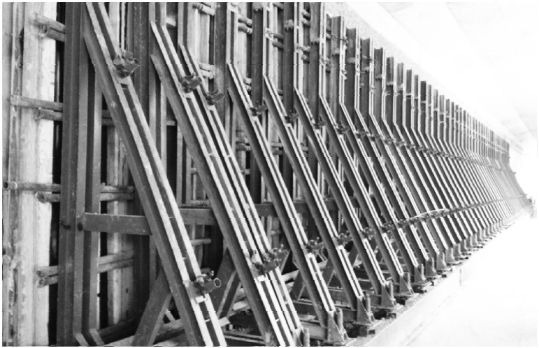(13)墙体模板拆除时,先拆除对拉螺栓,然后拆除竖向钢花梁及内棱钢管,并将加腋处的底板预埋钢筋割除,然后拆除斜支撑,从模板下部轻轻撬动模板,使之与墙体分离。在模板敲离时,模板上方架设临时支撑,防止模板倾倒。