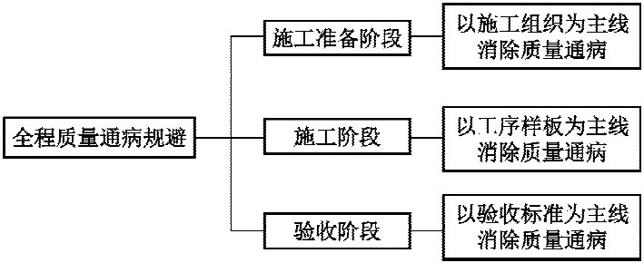 实施质量全程控制制度,以规避前一阶段的通病,提升后期工程的质量。具体来说就是:在施工准备阶段,以施工组织为主线消除质量通病;在施工组织中单独设立章节提出质量通病控制措施,并对具体各专业常见质量通病进行详细阐述;在施工过程中,以工序样板为主线消除质量通病;在验收阶段,以验收标准为主线规避质量通病(图3-5)。