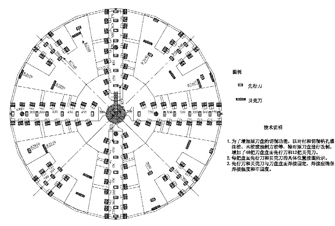 (3)增强盾构切削硬质障碍物的能力,在刀盘盘面上增加先行刀和贝壳刀刀具,确保盾构保持良好的工作状态进行穿越段掘进施工(图4-29)。