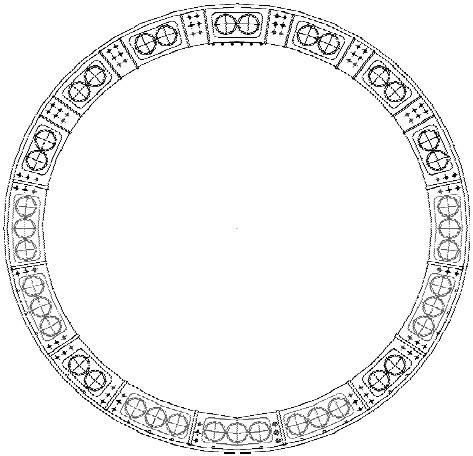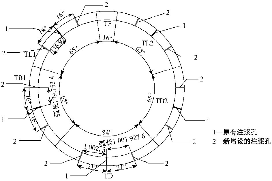 (6)为了在穿越建(构)筑物时在隧道各不同部位进行针对性的壁后注浆,所以对穿越段管片进行优化,增设注浆孔。注浆孔的位置见图,图4-31中1为原有注浆孔,2为新增设的注浆孔。