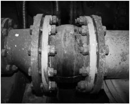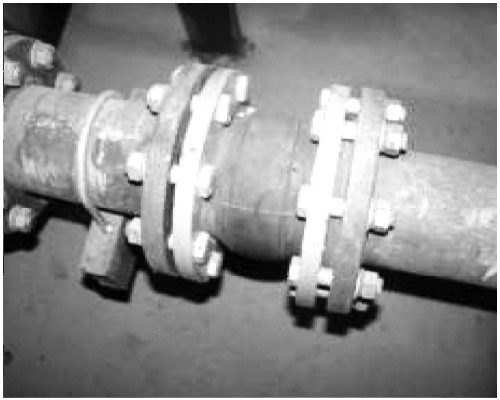防治措施:螺栓长度应根据两片法兰片的厚度进行计算确定,确保螺栓拧紧后,其突出螺帽的螺杆长度为其螺杆直径的1/2;靠近螺母这一端的应增加一片垫片,对于有振动的管道附件,其法兰连接所用的螺栓应再增设一片弹簧垫;在潮湿的场所,法兰应进行防锈刷油防腐处理,螺栓宜采用镀锌螺栓。
