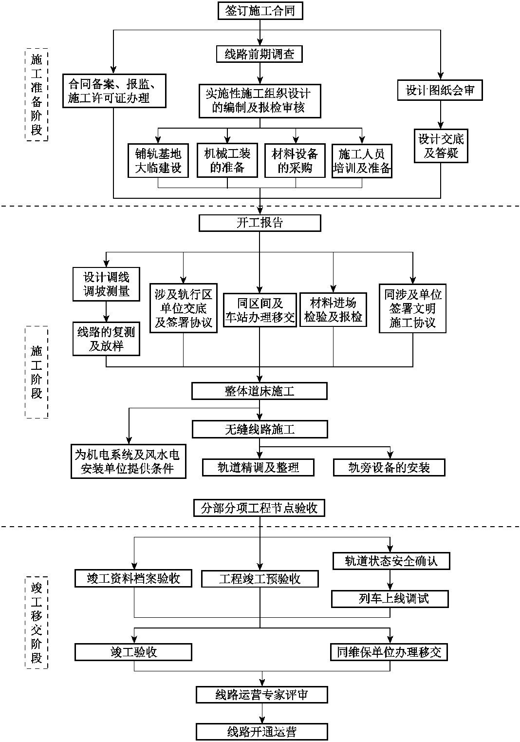 在项目实施过程中,铺轨同车站、区间单位土建单位办理移交后,组织铺轨施工作业。采用架轨法进行道床施工,道床施工完毕称为“短轨通”,后一阶段进行焊轨作业形成无缝线路轨道,无缝线路施工完毕称为“长轨通”。同时铺轨施工在“短轨通”后陆续为后续的机电系统单位、风水电安装单位提供施工条件。轨旁设备的安装需待无缝线路锁定完毕后进行施工。
