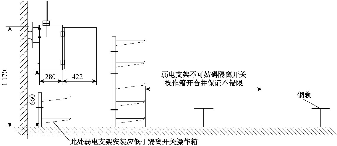 在车站端头安装有接触网专业隔离开关的车站,通号专业电缆支架需避开隔离开关操作机构安装位置,并且不能影响隔离开关操作机构箱箱门的开合操作,如图12-8所示。