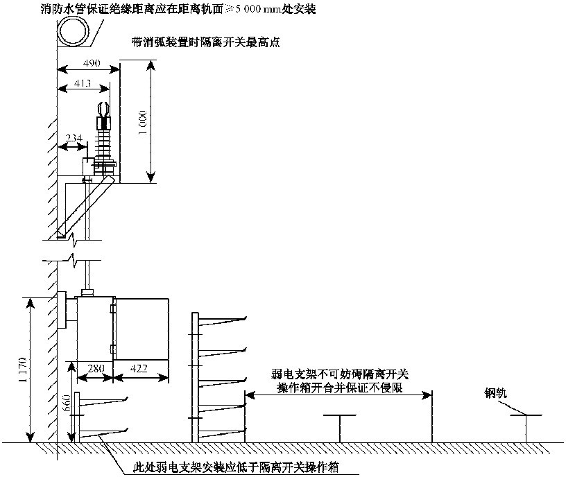 (1)如果有消防水管经过接触网隔离开关处时,应满足不妨碍隔离开关操作箱的操作,也要满足从上方经过时保证与隔离开关带电部分的绝缘距离500mm,如图12-9所示。