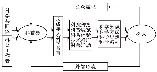 科学技术普及是一个系统过程。从科普的内部来看,科普是由科普源系统、科普过程系统、社会公众系统组成的一个巨系统。科学技术的不断发展和公众对科学技术的强大需求形成科普的动力,推动科普事业的发展。科学家群体的存在,产生与普通公众的知识落差,公众对知识的多元化需求,构成科普千变万化的结构——内容和形式。所以,科学技术普及实际上是一种信息流变的系统,它是把科学家群体所拥有的科学知识、科学方法、科学思想、科学精神,通过科普工作者,传送到公众,并内化为公众自己的素养、能力、思想、道德、观念、信念等的系统过程。如下图所示。