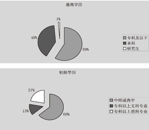 (3)科学教师的科学素养和水平不够。科学教师队伍专科及以下学历占多数,近60%,初始学历多为中师或高中。相当部分科学教师对科学本质的认识、对科学教育的认识还十分混沌。加之专任程度不够,他们受到培训的机会也不均衡,显示出很大的差距。