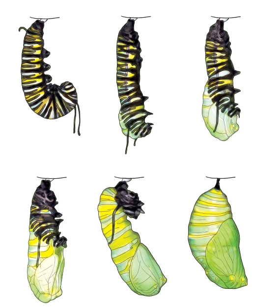 ·如果你养蝴蝶幼虫,会发现原来疯狂进食的幼虫蜕皮长大后,就不再大快朵颐了。它们待在那里不爱动弹,当你还在担心它们是不是吃得过饱撑到了的时候,幼虫们其实是在准备新一次的变形——化蛹。找到一个合适的地方后,它们会脱去最后一层“幼虫外套”,换上包裹严实的“蛹装”。