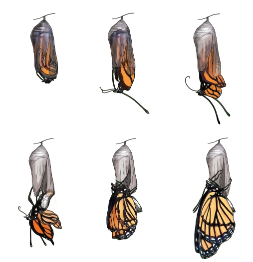 ·从外表上看,蝶蛹不吃不动,但内部其实正发生着剧烈的变化,进行着向成虫形态、器官转化的过程。一旦时机成熟,成虫便会从蛹壳内爬出来,完成蝴蝶最后一次华丽的变形——羽化。如果你以为蝴蝶从蛹里爬出来就万事大吉了,那可就大错特错啦!刚从蛹中爬出的蝴蝶肚子胖胖的、翅膀皱皱的,它还需要完成体液的“乾坤大挪移”——让肚子里的液体流到翅脉中,将其撑起。这个时候假如蝴蝶掉在地上,翅膀就会变成畸型,它有可能就会失去飞行能力,坐以待毙。