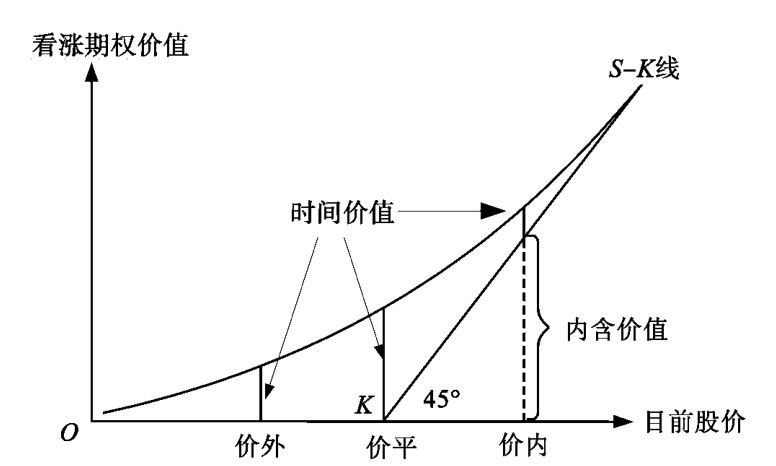 对价外期权而言,时间价值就是期权的价值; 而对价内期权来说,因为内在价值可由股价及执行价格的差求算出来,故时间价值一求出,便可计算出价内期权的价值。因此,各种期权的定价公式(包括将在本书第五章讨论的B-S公式),其实就是在计算时间价值。