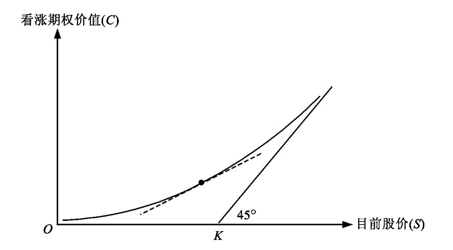 N(d1)也是看涨期权和股价关系图形的切线斜率,因为股价变动引起看涨期权变动的大小的比例,在数学式的意义就是切线的斜率。随着股价的上涨,切线斜率将增加,最高到45°,此时切线斜率为1; 随着股价下跌,切线斜率将下降,最极端的状况为水平切线,此时切线斜率为0,如图5-2所示。