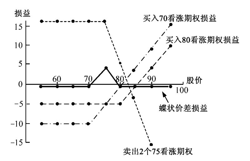 其实蝶状价差可以看成是两种价差的组合,即牛市价差加上空头价差的组合。上例中C70+C80-2C75可分解成: