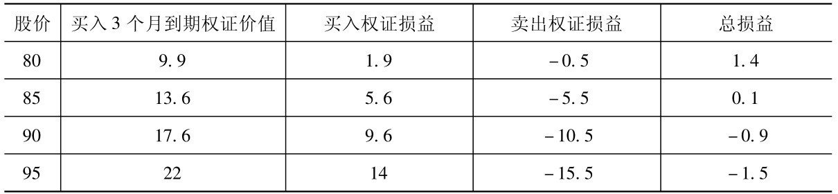 对角价差(diagonal spread)是指同时买入及卖出不同执行价格、不同期满日的看涨期权,一买一卖所形成的策略。譬如买入一个3个月后到期,执行价格为75元的看涨期权,另外卖出一个1个月后到期,执行价格为85元的看涨期权。本书将对角价差损益图留为本章习题,以供读者练习。
