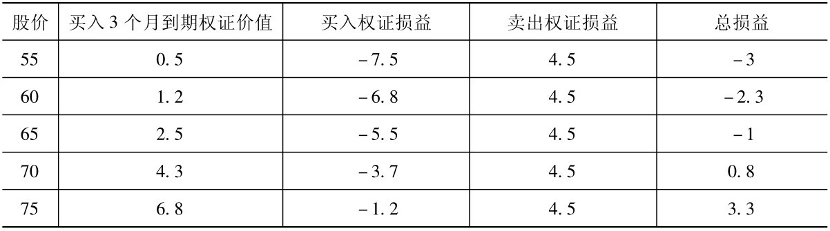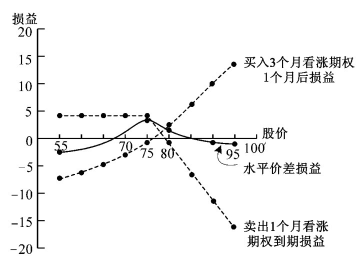 假设以8元买入执行价格为75元,期满日为3个月的中国石油看涨期权,另外以4.5元卖出执行价格为75元,期满日为1个月的中国石油看涨期权。1个月后,4.5元的看涨期权到期,将水平价差证券组合的损益绘成图6-18。