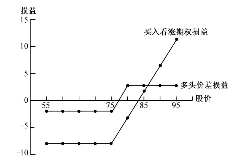 图6-15 牛市价差与买入看涨期权到期损益比较